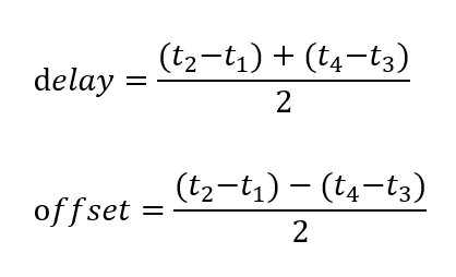 经过延迟响应同步机制后,从时钟获得t1,t2,t3,t4四个精确的时间戳,可以据此计算offset和delay: