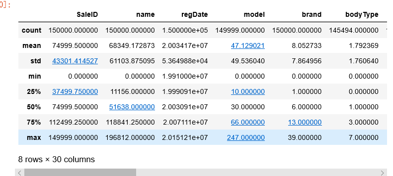 例如总数,平均值,标准差,最小值,25%、50%、75%分数,最大值等。我们可以通过观察某些值提前选定某些异常值或缺失值。
