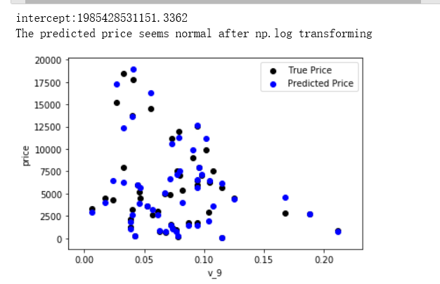 绘制特征v_9的值与标签的散点图,图片发现模型的预测结果(蓝色点)与真实标签(黑色点)的分布差异较大,且部分预测值出现了小于0的情况,说明我们的模型存在一些问题